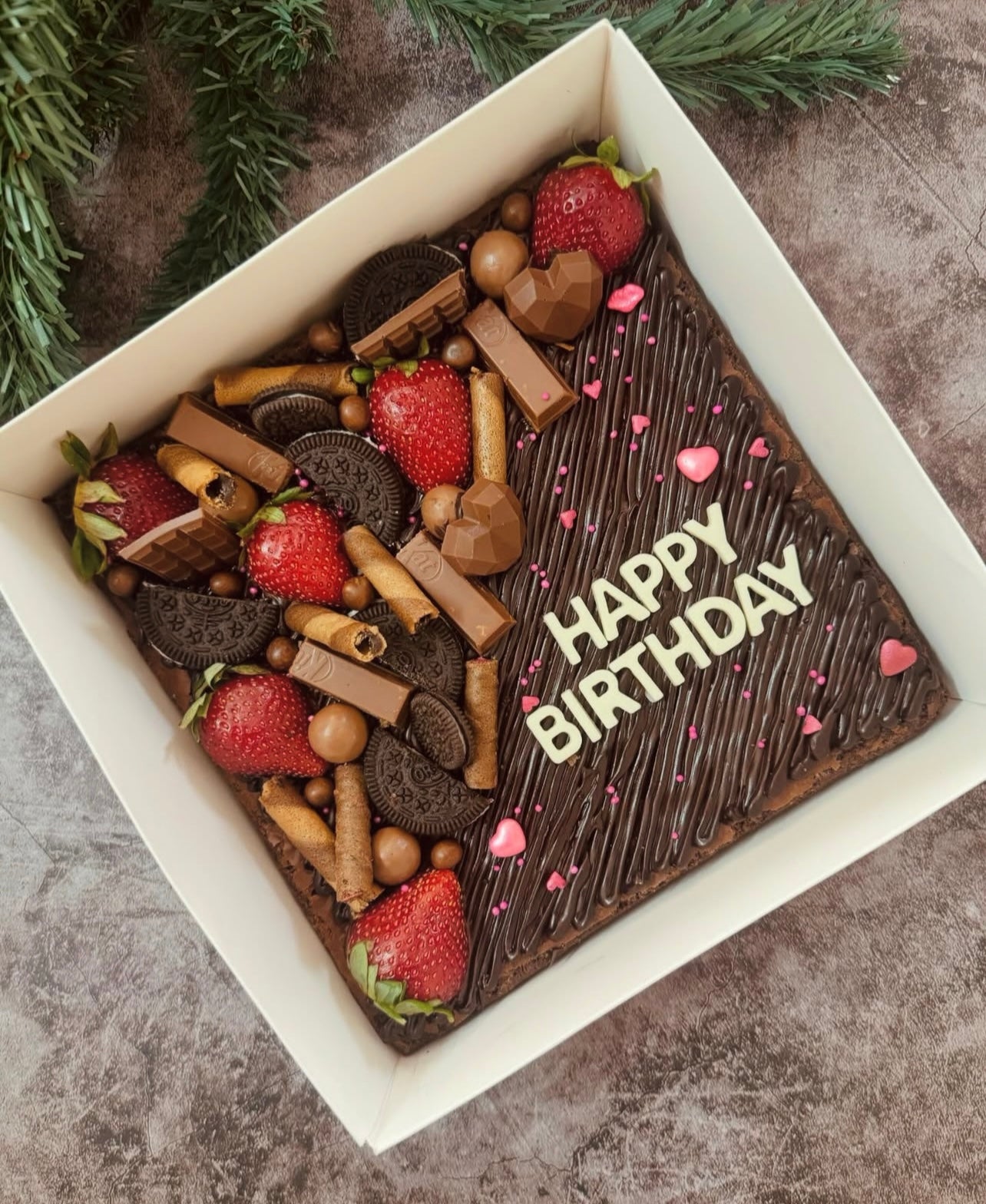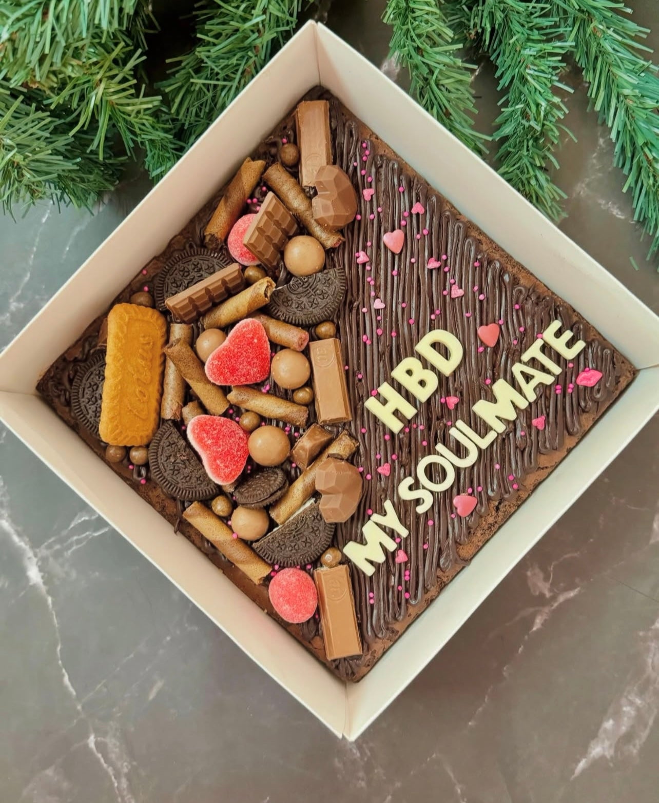 Our custom brownies are the ultimate way to celebrate, gift, or send a sweet message. Each decadent 7-inch square brownie is baked to fudgy perfection, then covered in smooth chocolate and finished with personalised writing or decoration of your choice.